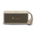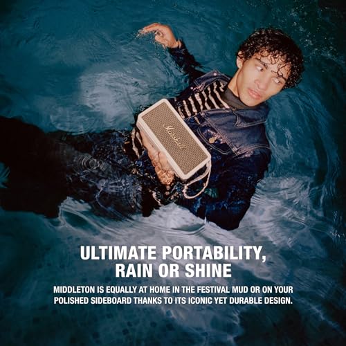 Details: Carry the heaviest portable sound in your hand. Middleton has a quad-speaker set-up to ensure the ultimate immersive experience wherever you roam. Control playback and adjust the bass and treble using the top-mounted controls or the dedicated app. Built-in Dynamic Loudness adjusts the tonal balance of the sound to ensure your music sounds brilliant at every volume. Middleton utilises True Stereophonic, a unique form of multi-directional stereo sound from Marshall. Experience superior spatial and binaural sound that flows around you and fills any space. This is absolute 360° sound – where every spot is a sweet spot.Middleton is equally at home in the festival mud or on your polished sideboard thanks to its iconic yet durable design. With a rugged IP67 dust and water-resistant build, a bit of rain and dirt won’t get under its skin. Middleton’s sturdy build comprises 55% post-consumer recycled plastic and is completely PVC-free. This speaker drops you straight into your music with no trouble or fuss – just pair, play and enjoy 20+ hours of portable playtime on a single charge. When the power is drained, plug Middleton in for 4.5 hours to return to full battery. Keep the music going when your phone battery is low, charge your device on the move with Middleton’s trusty power bank feature. Middleton also connects to other Middleton speakers, amplify the sound with Stack Mode and discover a sound as big as your imagination. Stacked or solo, Middleton fills whatever space you’re in with colossal sound.