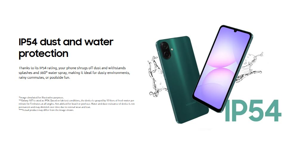 IP54 dust and water protection Thanks to its IP54 rating, your phone shrugs off dust and withstands splashes and 360° water spray, making it ideal for dusty environments, rainy commutes, or poolside fun.