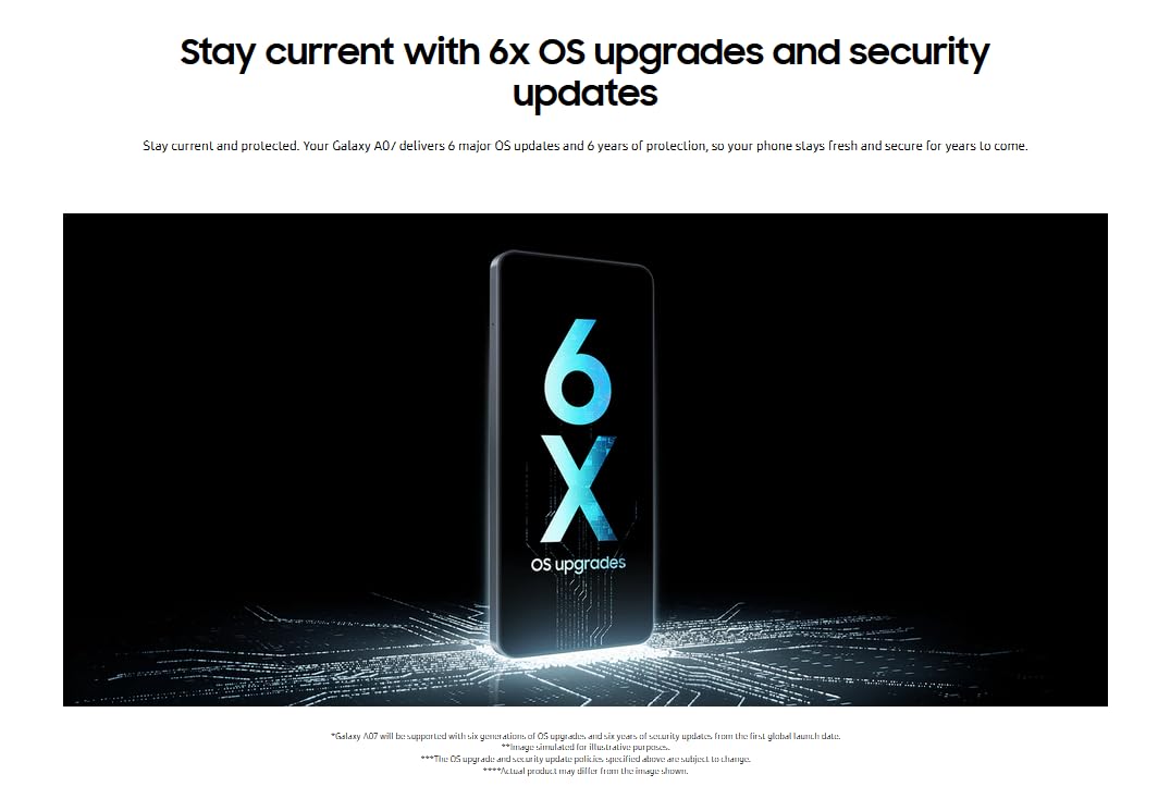 Stay current and protected. Your Galaxy A07 delivers 6 major OS updates and 6 years of protection, so your phone stays fresh and secure for years to come.