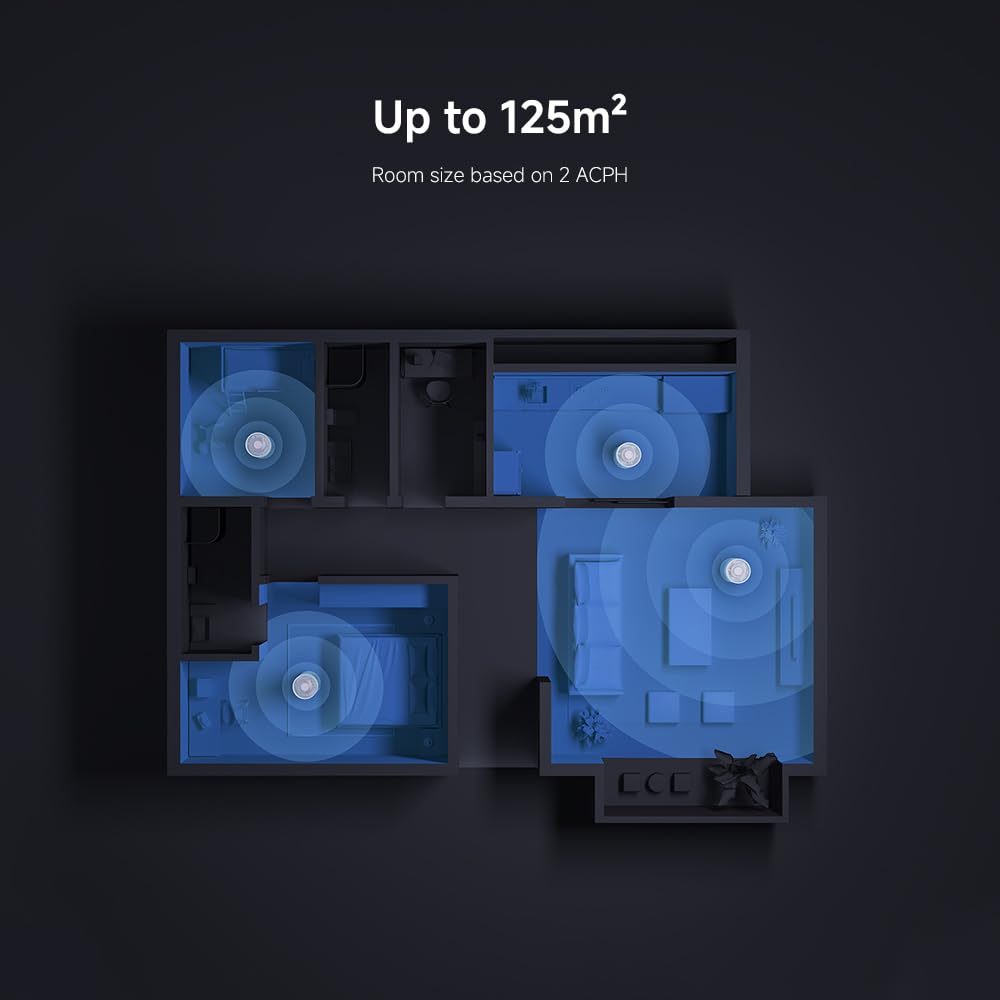 • Ultra-High 600 m³/h CADR: Cleans large rooms up to 125 m² with purity efficiency of 99.98% for particles ≥ 0.3 µm—even effective down to 0.1 µm