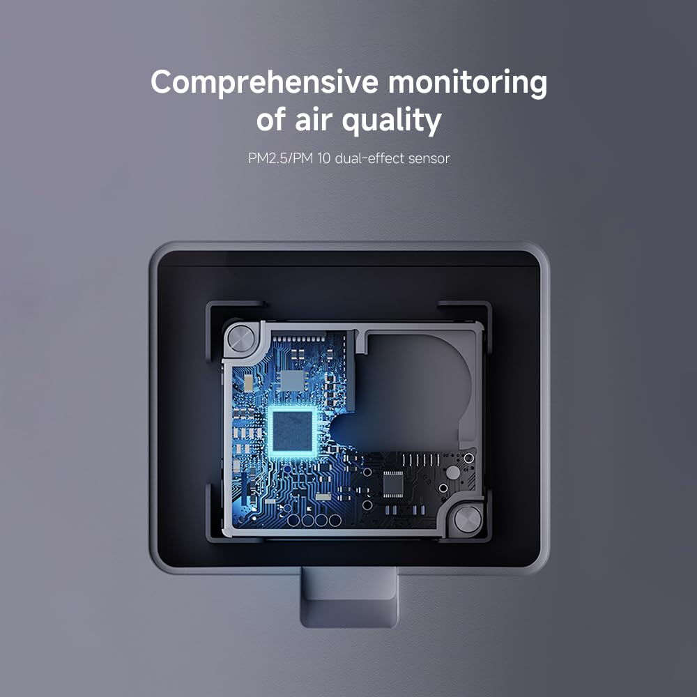 • Real-Time Dual Sensor & OLED Display: Monitors PM2.5 and PM10 levels instantly and adjusts fan speed in Auto mode; display shows air quality, temperature, humidity, filter status, and Wi‑Fi connection status