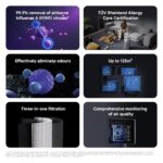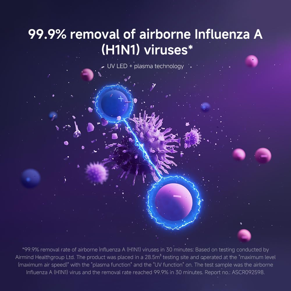 • Antiviral UV‑C & Plasma Technology: Built-in UV‑C LED and plasma generator eliminate airborne bacteria and viruses like Influenza A (H1N1) with 99.9% effectiveness